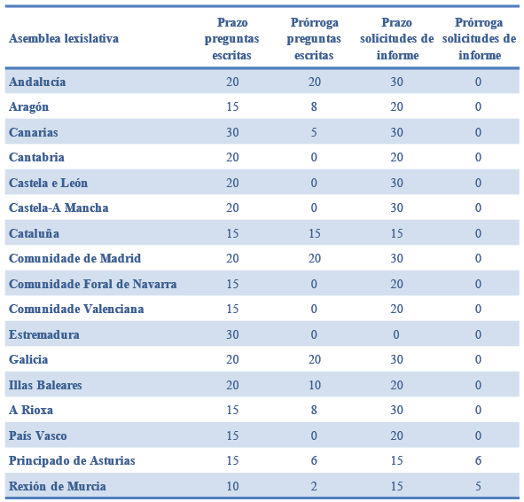 É relevante sinalar que o Parlamento de Cantabria, as Cortes Valencianas, de Castela e León, de Castela-A Mancha, a Asemblea de Estremadura e o Parlamento Vasco impiden aos seus respectivos consellos de goberno establecer ningunha prórroga ao prazo máximo de resposta establecido nos seus regulamentos. Pola súa parte, Andalucía, a Comunidade de Madrid e Galicia facultan os seus executivos a prorrogar por ata 20 días a remisión da resposta parlamentaria, mentres que os parlamentos do Principado de Asturias (6 días), Canarias (5 días) e, sobre todo, a Rexión de Murcia (2 días) establecen os prazos máis curtos de prórroga na remisión da resposta.